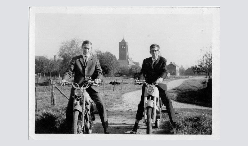Disse foto van de jonges met eur brommers brink mien geliek op verschillende gedachten van vrogger. Wat wi-j hier zien is ‘n mooi veurbeeld van hoe wi-j ons toentertied bezig hielen en wat veur ons belangriek was. Nog efkes, los van de kleren, (‘t zondagse pak kwam meistens maor één dag in de week uut de kas) mo’j veural kieke naor dat, wat ze ‘onder de kont hebbe’. En dat lug d’r niet um. Toon het een Zündapp en Wim het een bitje een vremp ding, een Kaptein?, Batavus? , Sparta?…ik wet ‘t niet. Brommers kieke in de tied dat disse foto gemaakt is, had een bietje ‘n andere beteikenis as vandaag de dag. Toen was ‘t ech brommers kieke en now (ik heb ‘t ook maor geheurd) is het meer efkes met een deerntje naor bute veur wat frisse loch. Wi-j hadde toen niet al te völ cente en het was niet zo vremp um ow te vergape aan al dat mooie grei wa’j toch niet kon betale.