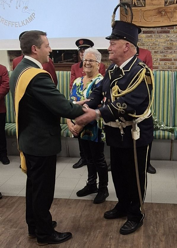Zijn grote inzet voor de vereniging heeft hem nu echter wel weer een federatieve titel opgeleverd. In het bijzijn van zijn vrouw, het bestuur en vele leden van de schutterij mocht hij zaterdagavond de bijbehorende versierselen in ontvangst nemen.