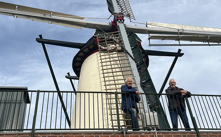 Hoofdfoto: Harry Peters (links) en Frans Reesing voor de St. Martinusmolen, die sinds een aantal weken weer in volle glorie draait.